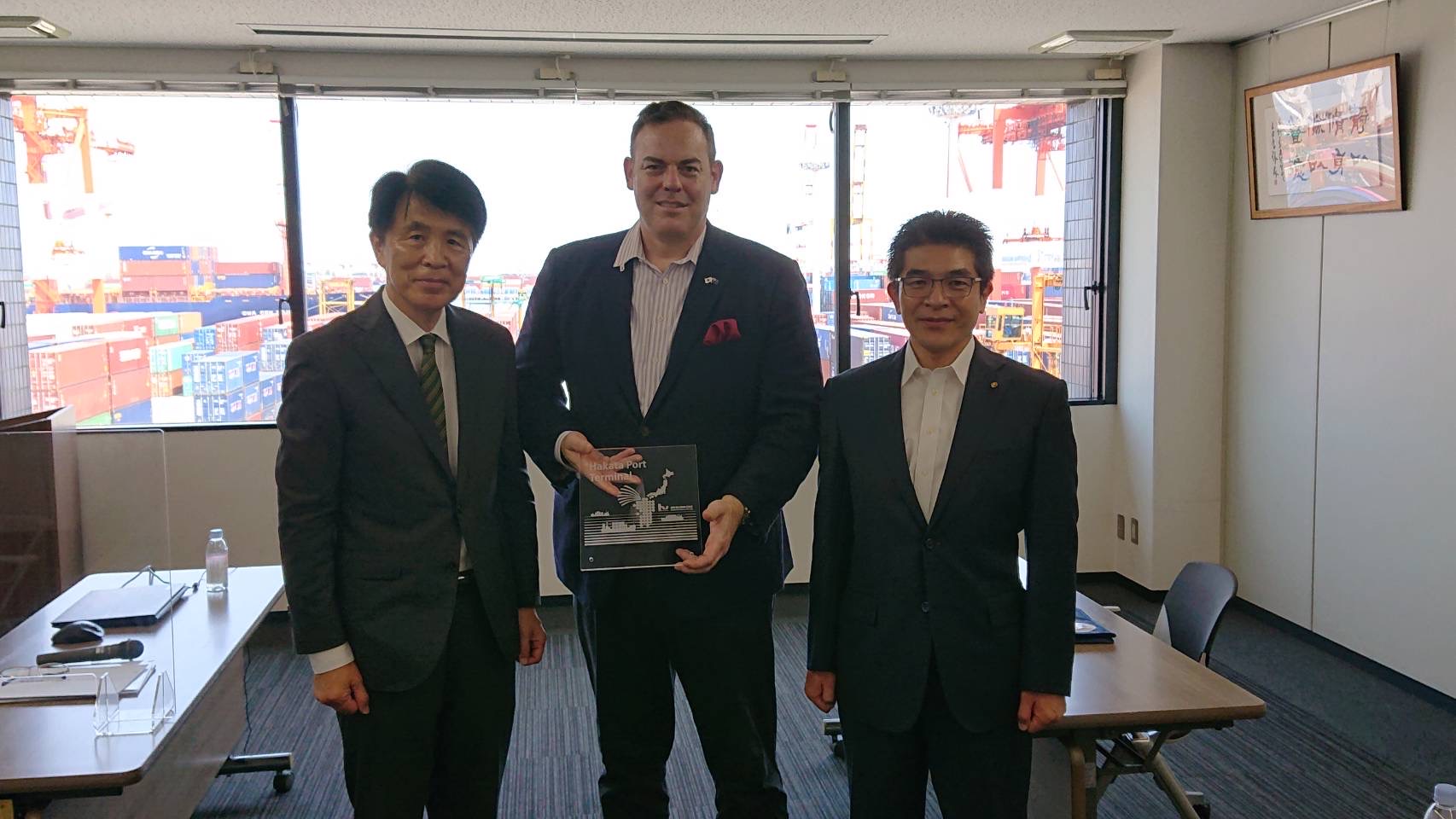 ニューマン氏は日豪間の貿易について関心が高く、港を見たいとリクエストがあり、博多港ふ頭(株)にお連れしました。オーストラリアは資源大国で石炭等の輸出が好調ですが、今後、脱炭素社会が進んでいく上で、輸出形態も変わっていくことから資源以外の輸出の可能性について探りたいと言うことでした。