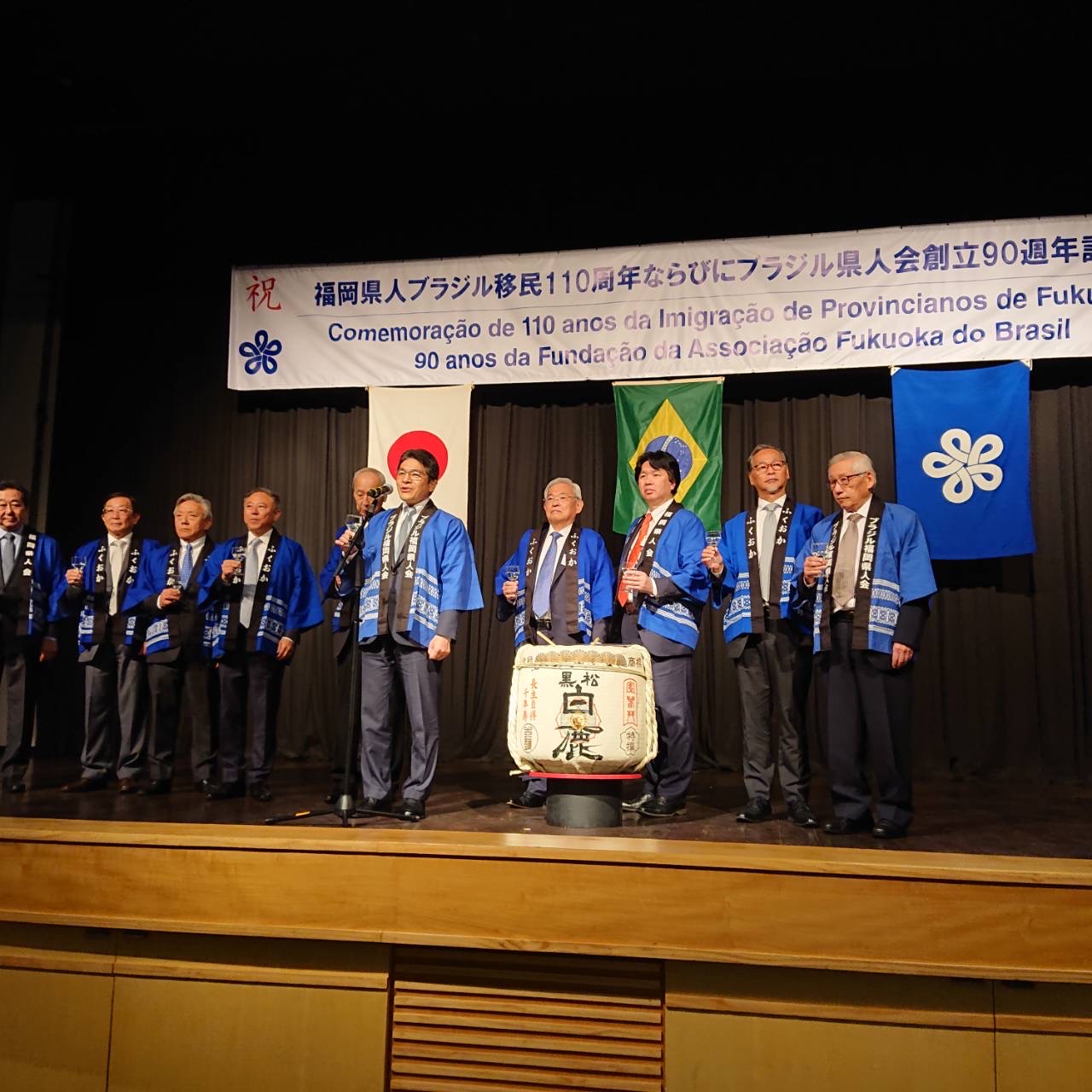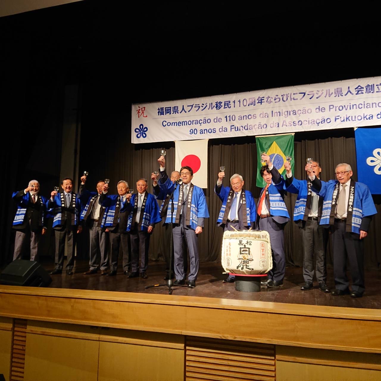 私は式典の2部で乾杯の発声ををさせていただきました。この度のブラジル訪問では、全ての訪問先で県人会の皆様には大歓迎され、そのことに対する感謝の気持ちと、この訪問でブラジル福岡県人会の皆様との強い絆を結ぶことができたことの喜びをお伝えし乾杯いたしました。
